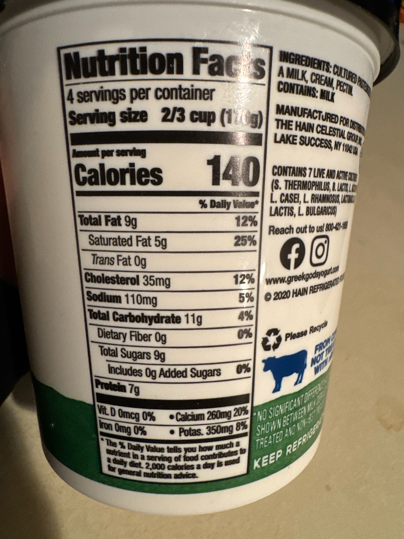 Greek Yogurt: Hain Celestial GroupThis is a solid choice for a protein-rich snack or breakfast component. It's a plain, unsweetened Greek yogurt with a clean ingredient list containing just cultured pasteurized milk, cream, and beneficial live cultures.
