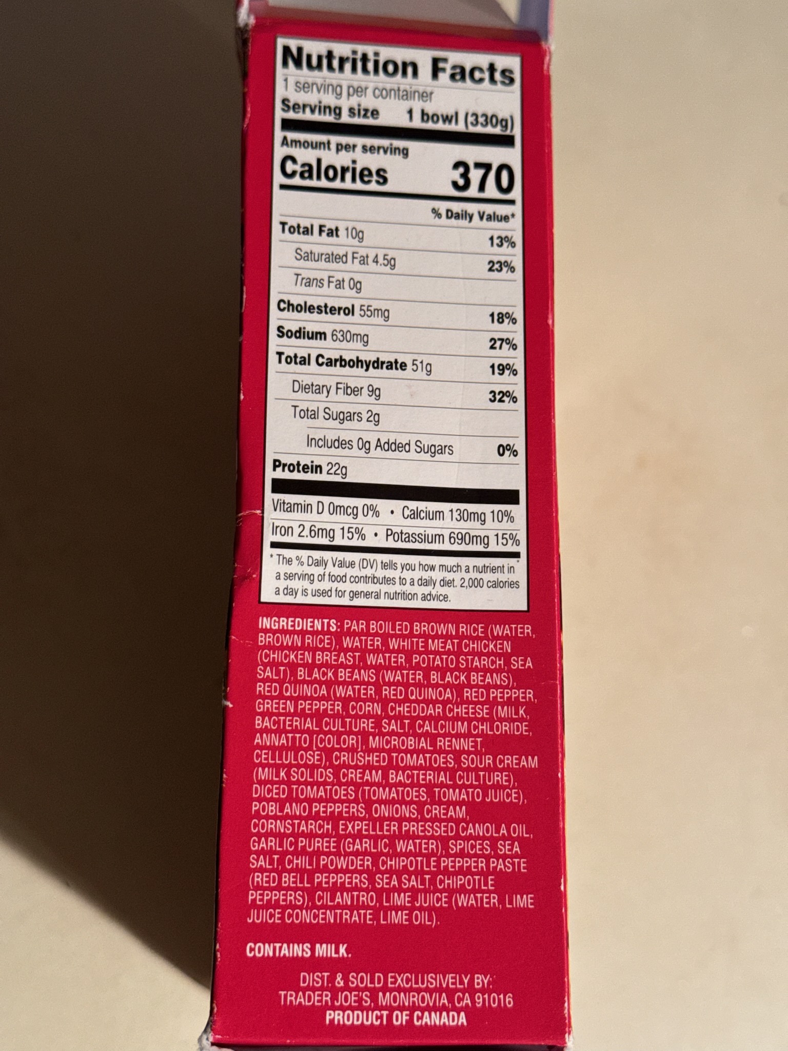 Bowl: Trader Joe'sOverall, this bowl is a reasonable choice, especially for a quick meal. It's got a good balance of macros, is relatively low in sugar, and has a decent amount of fiber. However, the sodium content is a bit high, and there are some processed ingredients to be aware of.