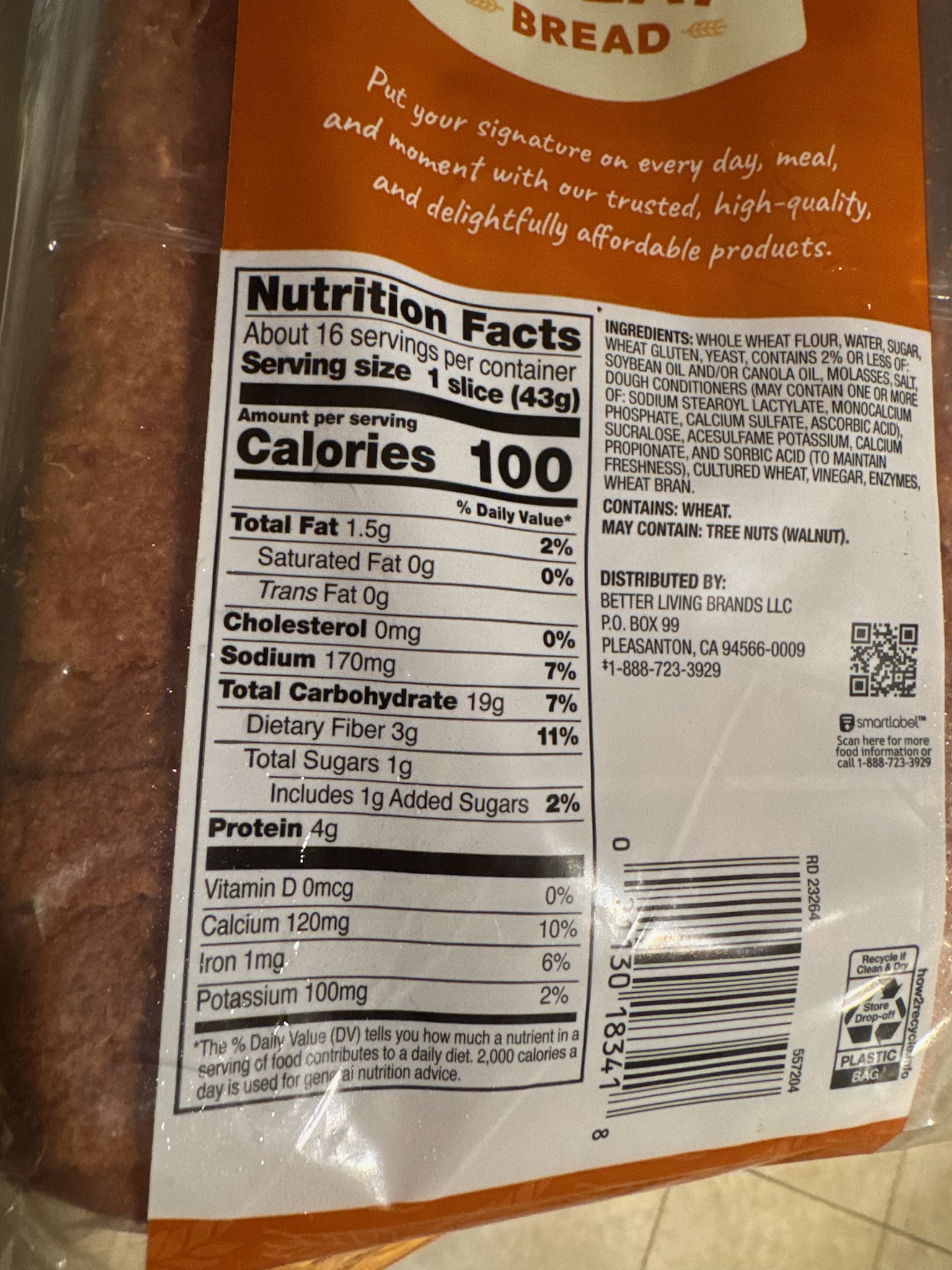Whole Wheat Bread (Better Living Brands)This is a fairly standard commercial whole wheat bread with a mediocre nutritional profile. While it's not the worst bread option available, it's also not particularly nutritious for a whole wheat product.