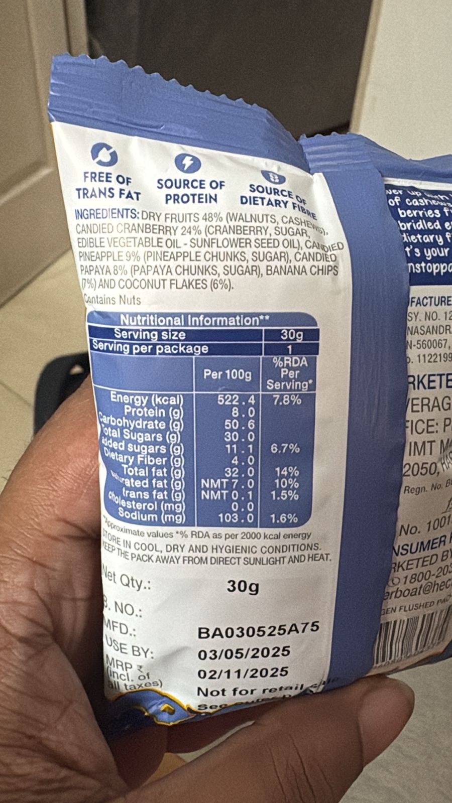 1. High Added Sugar: 11.1g of added sugar per 100g is substantial. Candied cranberries, pineapple, and papaya mean a lot of the fruit content is essentially sugar, leading to blood sugar spikes and crashes.