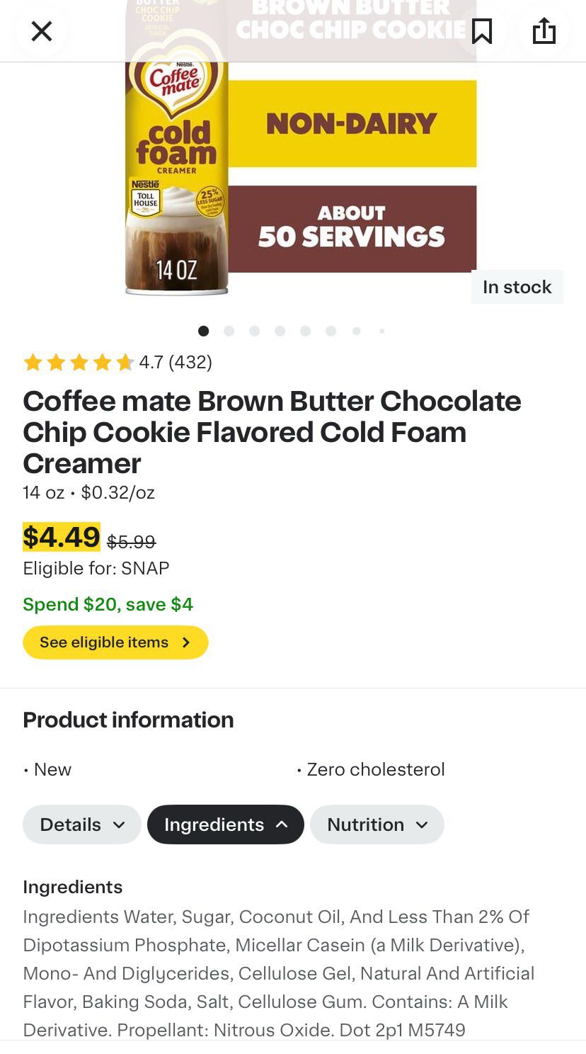 Cold Foam Creamer: Coffee mateThis Coffee Mate creamer is a sweet treat, but it's best to use it sparingly. It's non-dairy, which is a plus for some, but it's loaded with sugar and coconut oil.