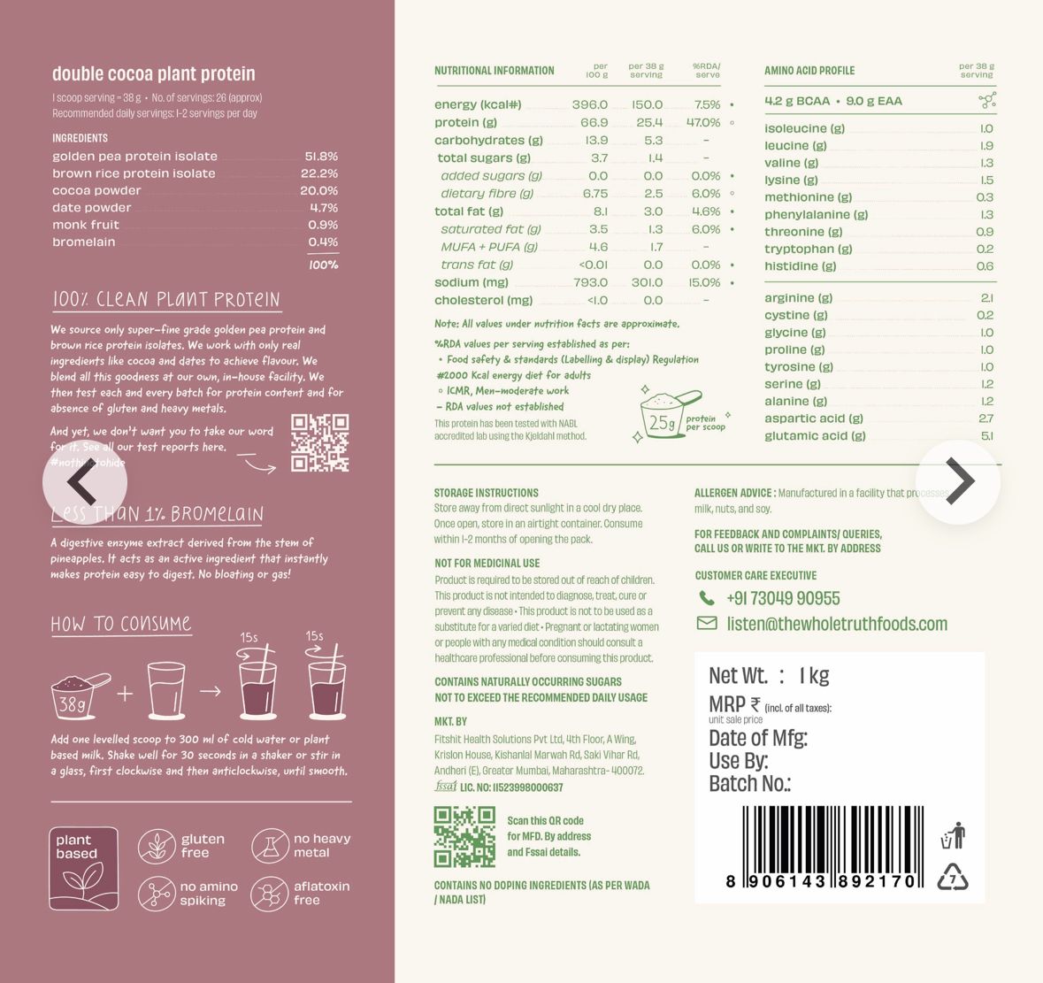 Plant Protein: The Whole Truth Double Cocoa Plant ProteinThis is a good choice for a plant-based protein powder, especially if you're looking for a clean label and minimal added ingredients. It focuses on protein from quality sources without unnecessary fillers.