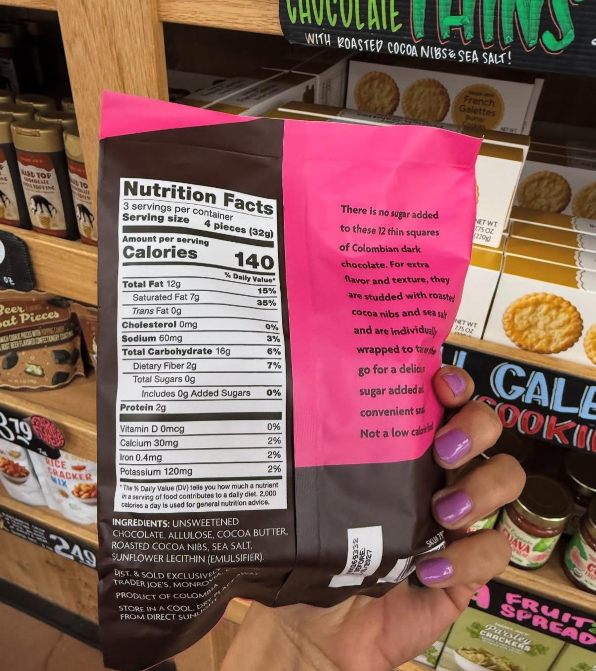Dark Chocolate Thins: Trader Joe'sThese dark chocolate thins are marketed as a treat with no added sugar, which is appealing. They use allulose, a sugar substitute, to achieve this.