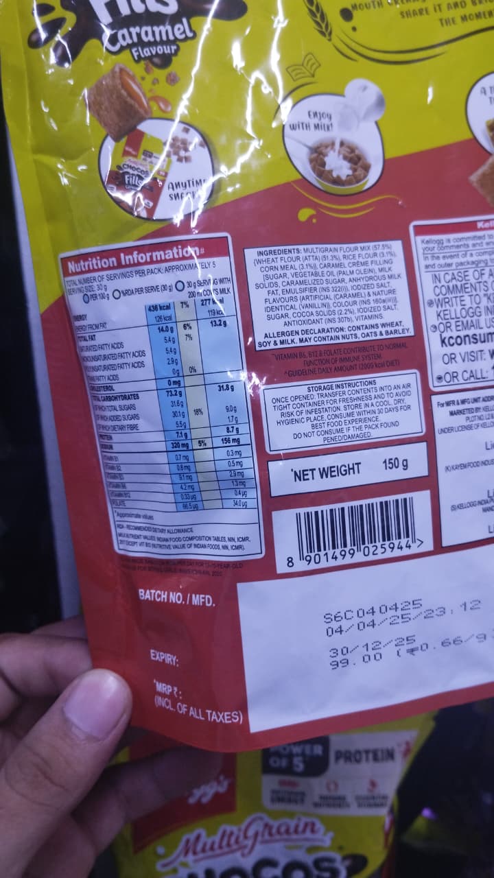 Cereal: Kellogg's Chocos Fills Caramel FlavourThis is a highly processed snack, essentially a dessert in cereal form. While it might appeal to kids, it's not a good choice for regular consumption due to its high sugar content and low nutritional value.