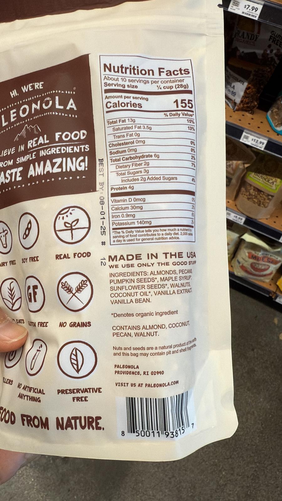 Granola: PaleonolaThis Paleonola is a grain-free granola made with nuts, seeds, and maple syrup. Overall, it's a decent snack option, but let's break it down.