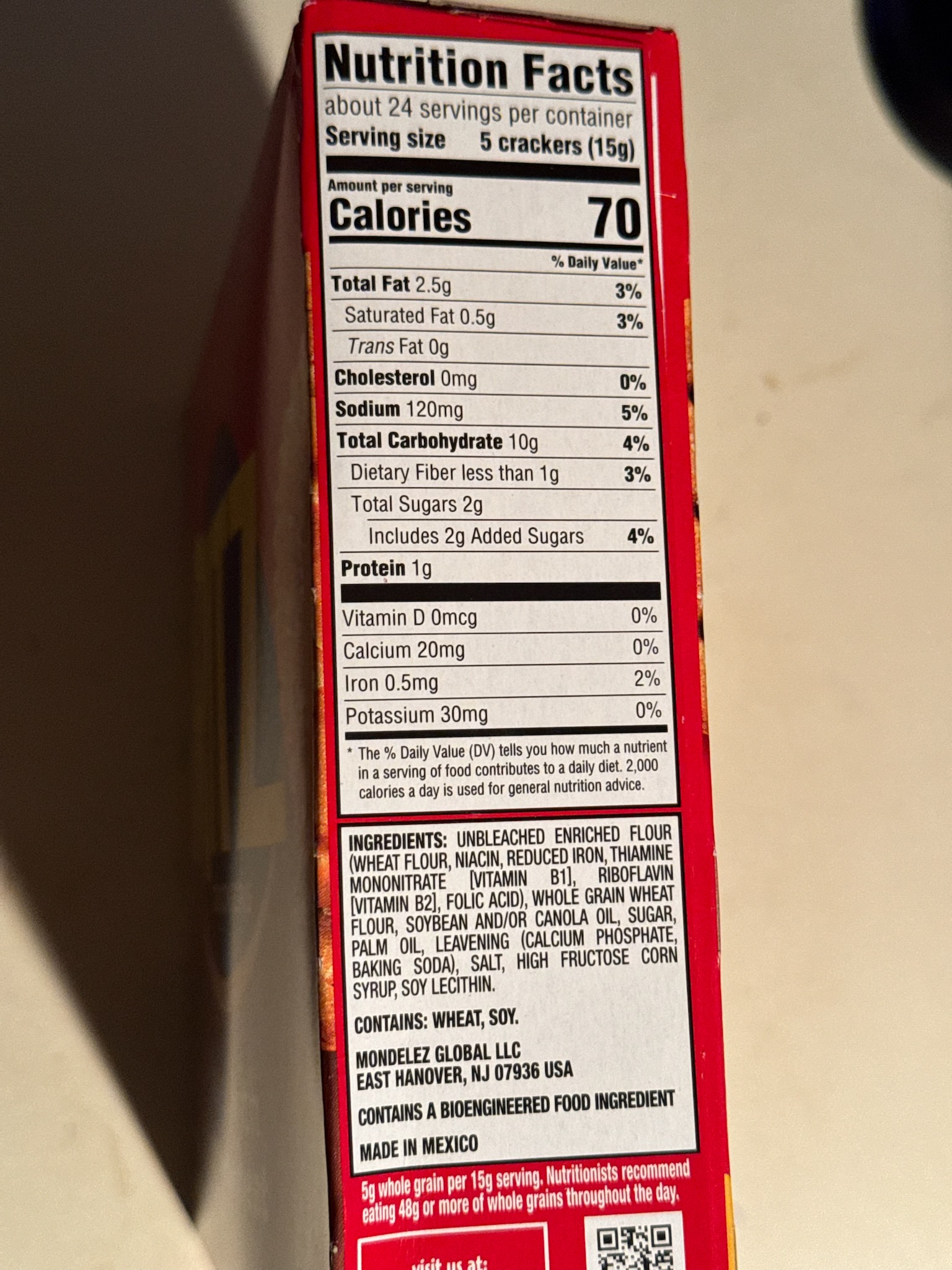 Crackers: MondelezThis is a highly processed snack with minimal nutritional value. While the calorie count (70) per serving is modest, the nutritional profile is concerning for both children and adults.