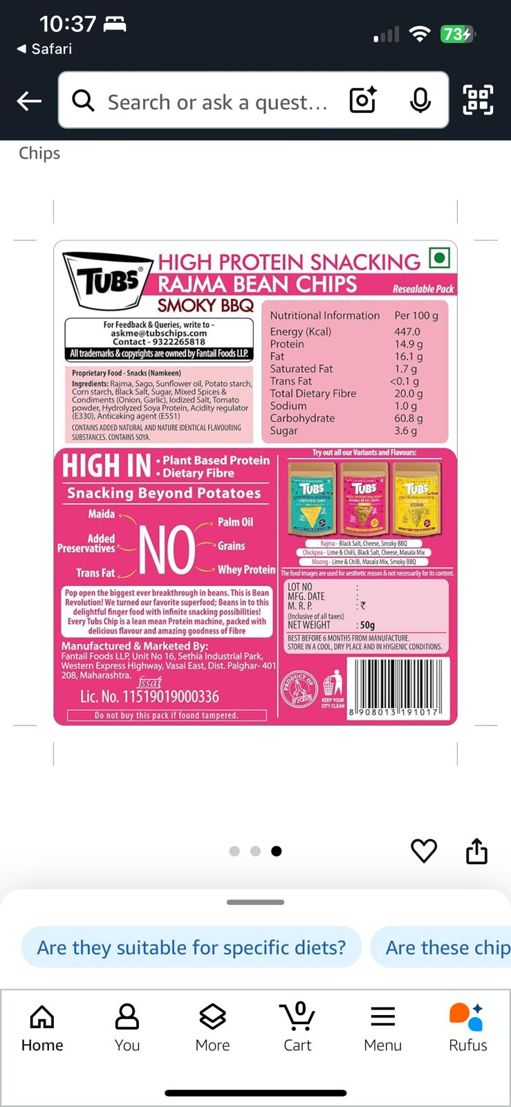 Bean Chips: Tubs High Protein Rajma Bean Chips Smoky BBQThese bean chips are marketed as a healthy alternative to potato chips, but let's see. Overall, they're calorie-dense and high in carbs, like most chips. For 100g, it's 447 kcal, 16.1g fat, and 60.8g carbs.