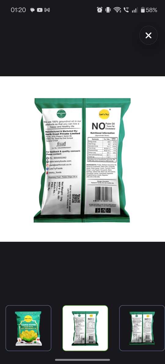 Bottom line: Decent choice if you really want chips—groundnut oil is a bit better than most, and sugar is low. Still, these are best reserved for an occasional treat. For a better snack, try roasted makhana (like Too Yumm or Happilo) or plain roasted chana. Got more snacks you want checked?