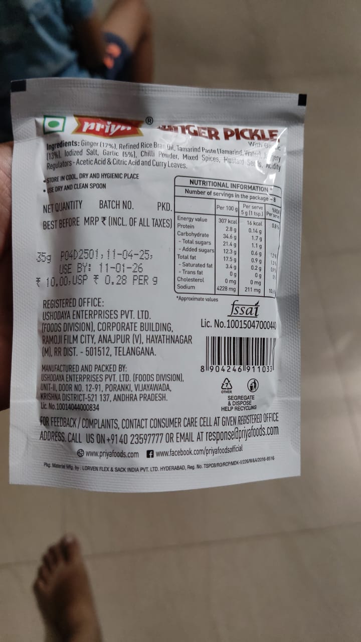 Ginger Pickle: PriyaThis ginger pickle is a flavorful condiment, but it's very high in sodium and added sugars for a small serving size. It should be used sparingly as a flavor enhancer rather than a significant part of a meal. The high salt content means it's not a healthy daily staple.