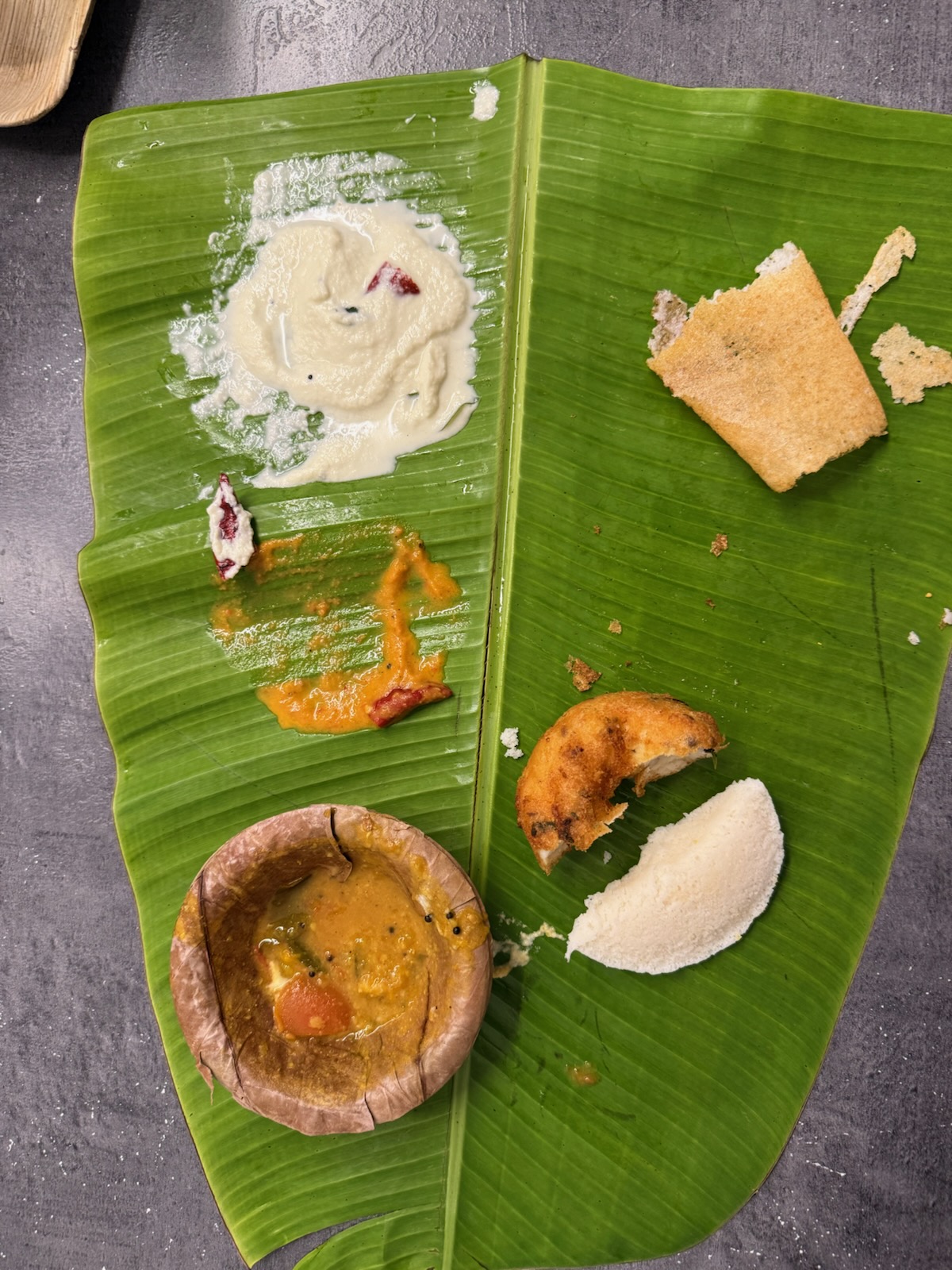 South Indian meal served on banana leaf: idli, vada, sambar and chutneysThis appears to be a traditional South Indian meal served on a banana leaf, likely for adults. While the presentation is culturally significant, it's important to consider the nutritional aspects: