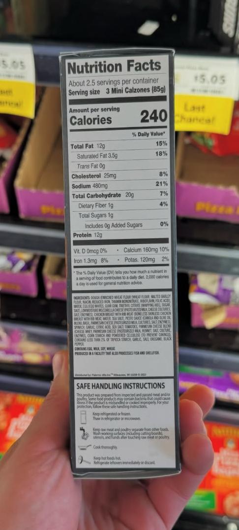 Mini Calzones: Unspecified BrandThese mini calzones could work as a quick meal component for kids or adults, offering a decent protein punch. The sodium content is a bit high, so balance it with low-sodium foods for the rest of the day.