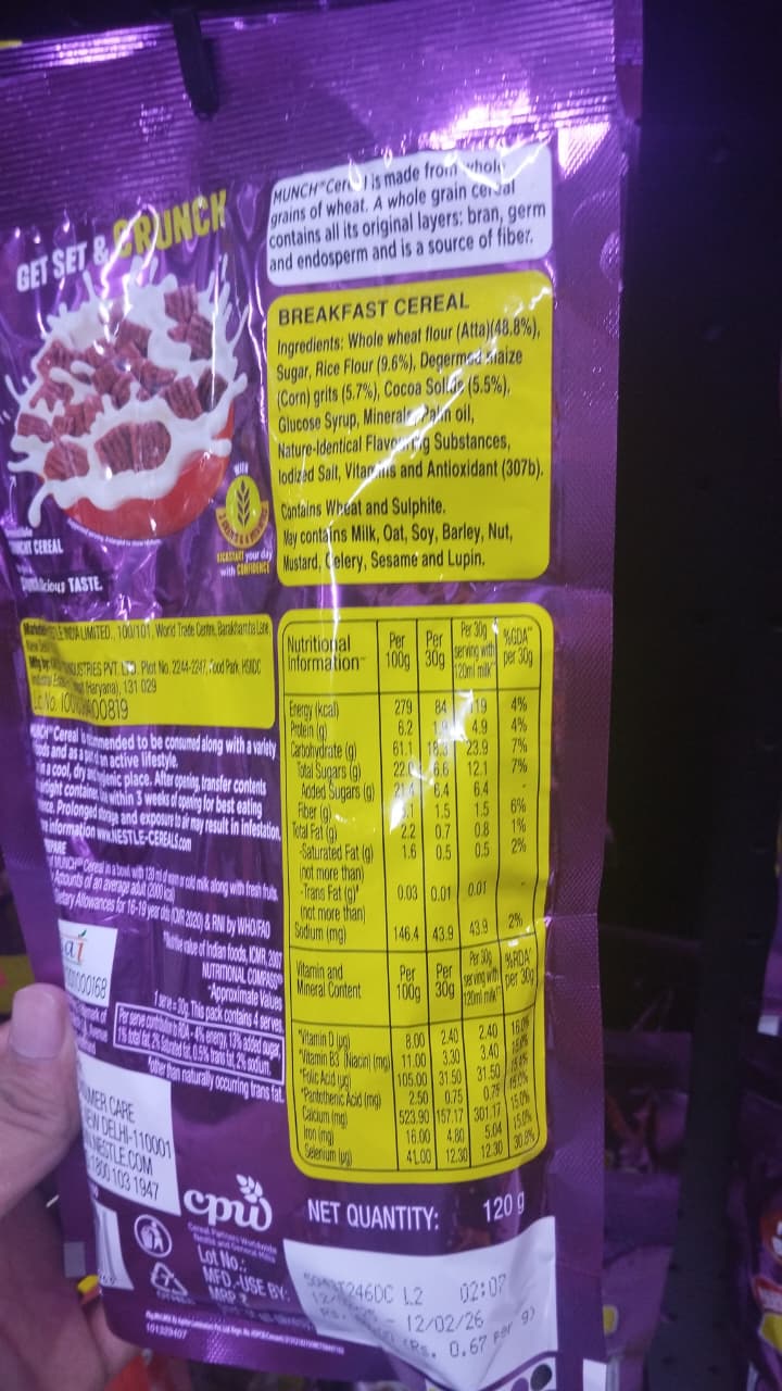 Breakfast Cereal: Nestle Munch CerealThis cereal is a high-sugar option, despite being primarily whole wheat. While it provides some fiber and vitamins, the significant amount of added sugar outweighs these benefits for a daily breakfast.