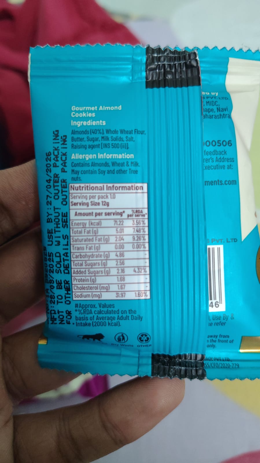 If you want a cookie, this is a better pick than most—almonds first is a win. Keep it to 1-2 pieces, and pair with tea or milk for better satiety. For a healthier snack, look for nut mixes (like Happilo or Nutraj) or roasted chana nearby. Let me know if you want more options or ideas for pairing!