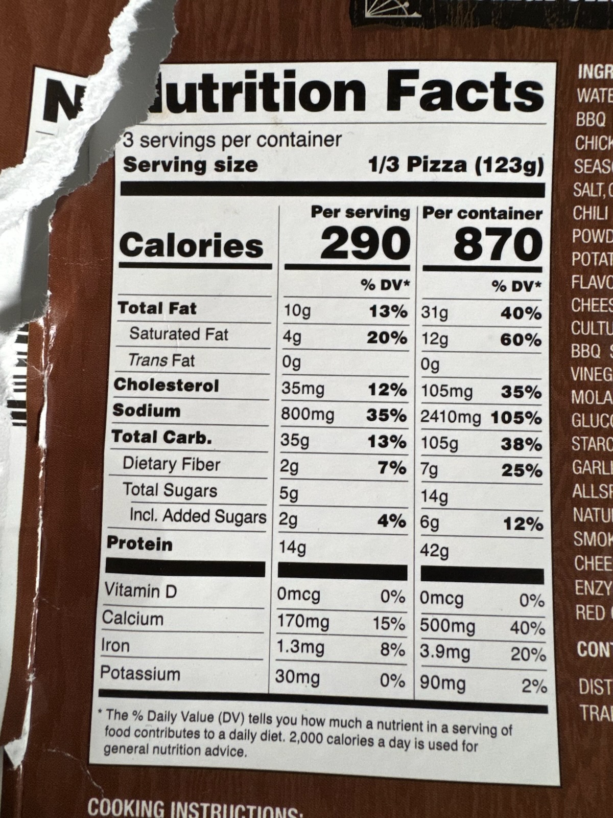 1. Sodium is extremely high at 800mg (35% DV) per serving - eating the whole pizza would exceed your daily sodium limit at 2410mg