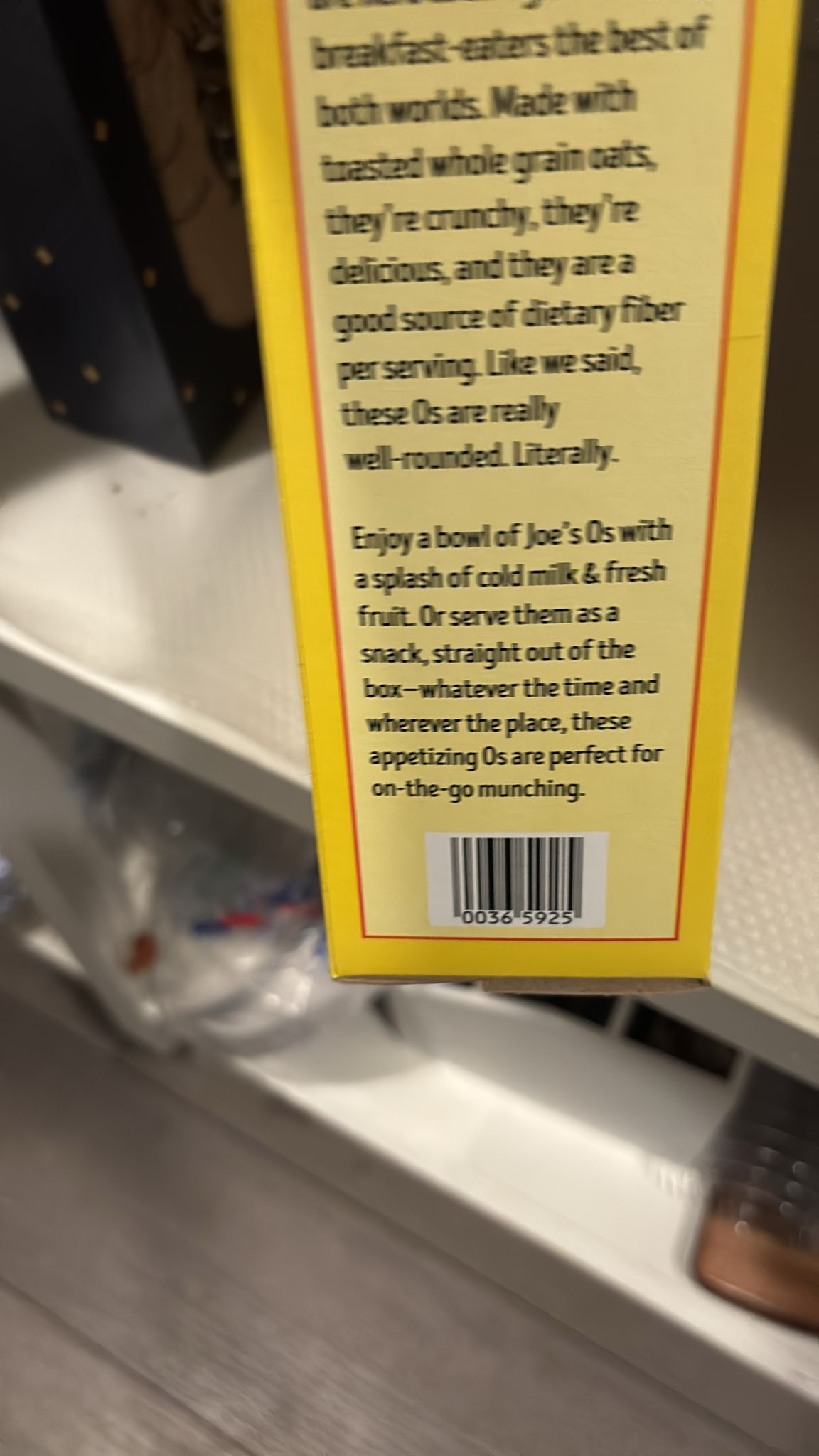 Cereal: Joe's OsBased on the marketing copy, this cereal is made with toasted whole grain oats and is a good source of dietary fiber. It's marketed as a versatile food for both breakfast and snacking.