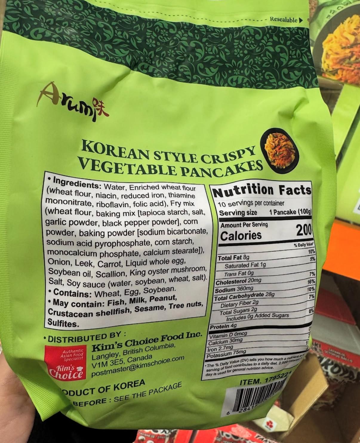 Vegetable Pancakes: ArumThese Korean-style vegetable pancakes are a decent quick meal option, especially when paired with a protein. They offer a simple way to incorporate some vegetables.The Good:1. Low Saturated Fat (1g): This is excellent, indicating healthier fat sources are primarily used.2. Zero Added Sugars: A big win for a prepared food item. This means any sweetness comes from the natural ingredients.3. Contains Real Vegetables: Onion, leek, carrot, scallion, and mushroom contribute some fiber and nutrients.The Concerns:1. Lower Protein (4g): For a meal, 4g of protein per 100g serving is quite low. This won't keep you full for long on its own.2. Enriched Wheat Flour as Primary Ingredient: While it provides some nutrients, it's not a whole grain. This means a quicker blood sugar spike compared to whole wheat options.3. Soybean Oil: This is a common industrial seed oil. While not inherently bad in small amounts, excessive consumption from many processed foods can contribute to inflammation.These pancakes are a convenient base, but don't rely on them as a complete meal. Pair them with a lean protein like grilled chicken or tofu, and add a side of fresh vegetables or a simple salad to round out the nutrition and keep you feeling satisfied. For alternatives, look for frozen whole grain-based patties or wraps that offer higher protein and fiber.