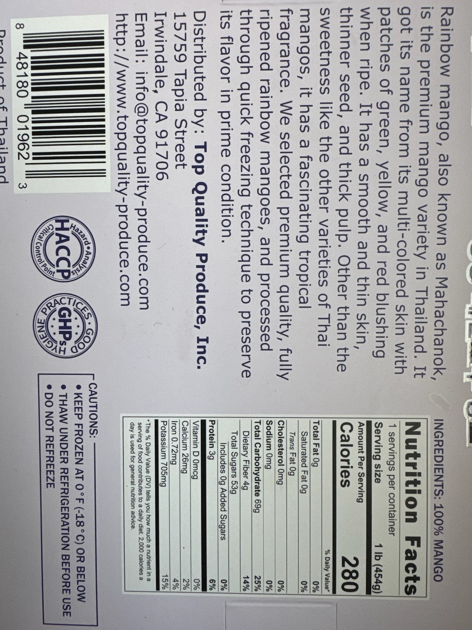 Fruit: Top Quality Produce, Inc.This frozen mango is a decent choice. It's 100% mango, so you're getting a whole food without added junk. The high sugar content (53g) is a concern, but it's all natural sugars from the fruit itself.