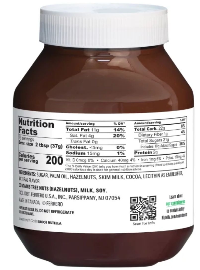 Spread: NutellaNutella is a tasty treat, but it's essentially sugar and palm oil. For 2 tbsp (37g), it's 200 calories, 11g fat (4g sat), 22g carbs (21g sugar, 19g added).