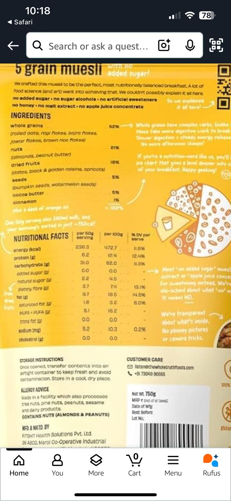 Muesli: FITSHIT Health SolutionsThis 5 Grain Muesli is a decent breakfast option, but let's break it down. It's primarily whole grains (62%), which is great for complex carbs and sustained energy. The nuts (21%) add healthy fats and protein, and the dried fruits (10%) provide some natural sweetness.