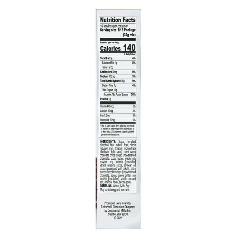 Chocolate Chip Cookie Mix: Ghirardelli Chocolate CompanyThis cookie mix is an occasional treat, not a dietary staple. Benefits: Iron (6% DV) is a plus, especially for kids. Concerns: High in added sugar (18g, 36% DV), which can contribute to blood sugar spikes and empty calories. The first ingredient is sugar, followed by enriched bleached flour, both of which are highly processed. The soybean oil is also highly processed and not ideal. Eat in moderation, maybe pair with a glass of milk for some protein and calcium to balance the sugar rush. Consider healthier alternatives like cookies made with whole grains and less sugar.