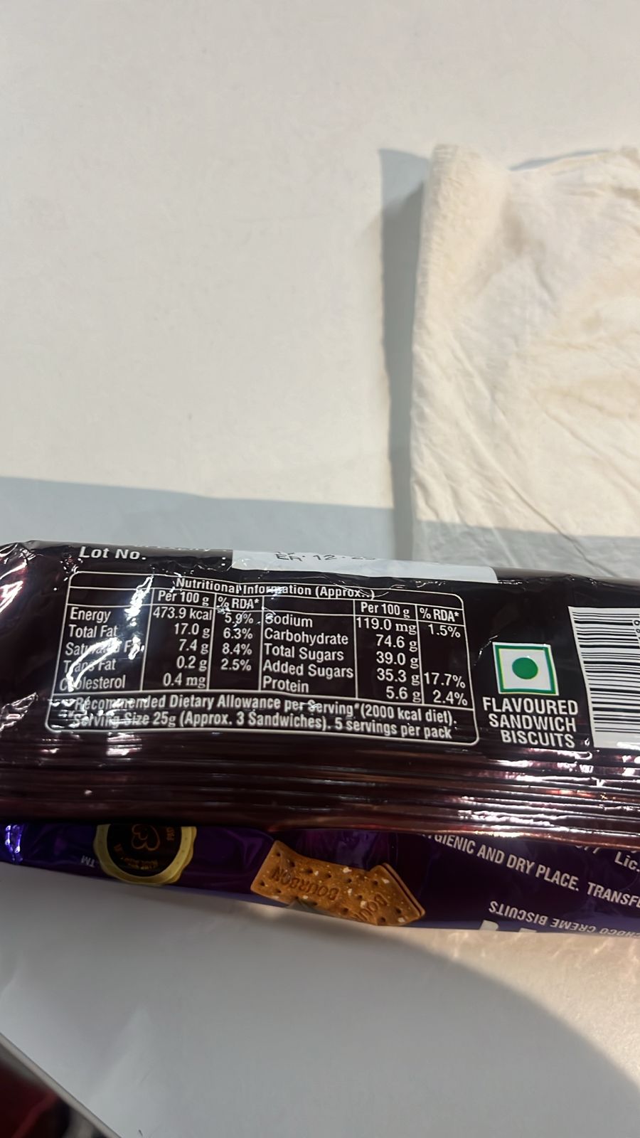 Flavoured Sandwich Biscuits: BourbonThese Bourbon biscuits are a treat, so let's evaluate them as such. Per 100g, they pack 473.9 kcal, which is calorie-dense.