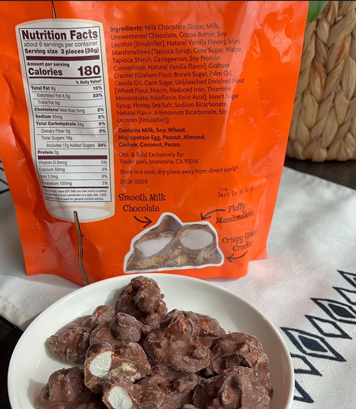 Chocolate Snacks: Trader Joe's Smooth Milk Chocolate, Fluffy Marshmallow, Crispy Graham CrackerThese are essentially S'mores in bite-sized form. As a treat, it's fine for occasional indulgence.The serving size of 3 pieces (36g) contains 180 calories, with 17g of added sugars (34% DV), which is quite high for a single serving. This makes it a high-sugar, calorie-dense item.