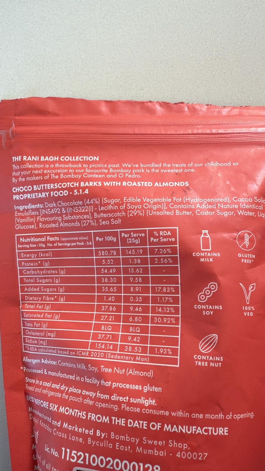 Chocolate Butterscotch Barks: The Rani Bagh CollectionThis product is essentially a candy, high in sugar and unhealthy fats, making it a treat to be consumed sparingly, not a regular snack. While it contains almonds, their nutritional benefit is largely outweighed by other ingredients.