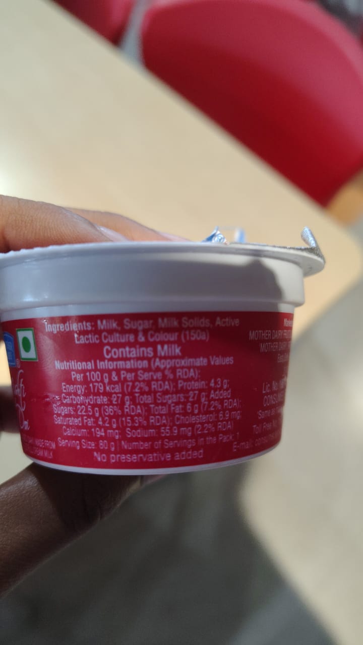 Yogurt: Mother DairyThis Mother Dairy yogurt is a mediocre snack option. While it provides some beneficial dairy components, the high sugar content significantly detracts from its nutritional value.
