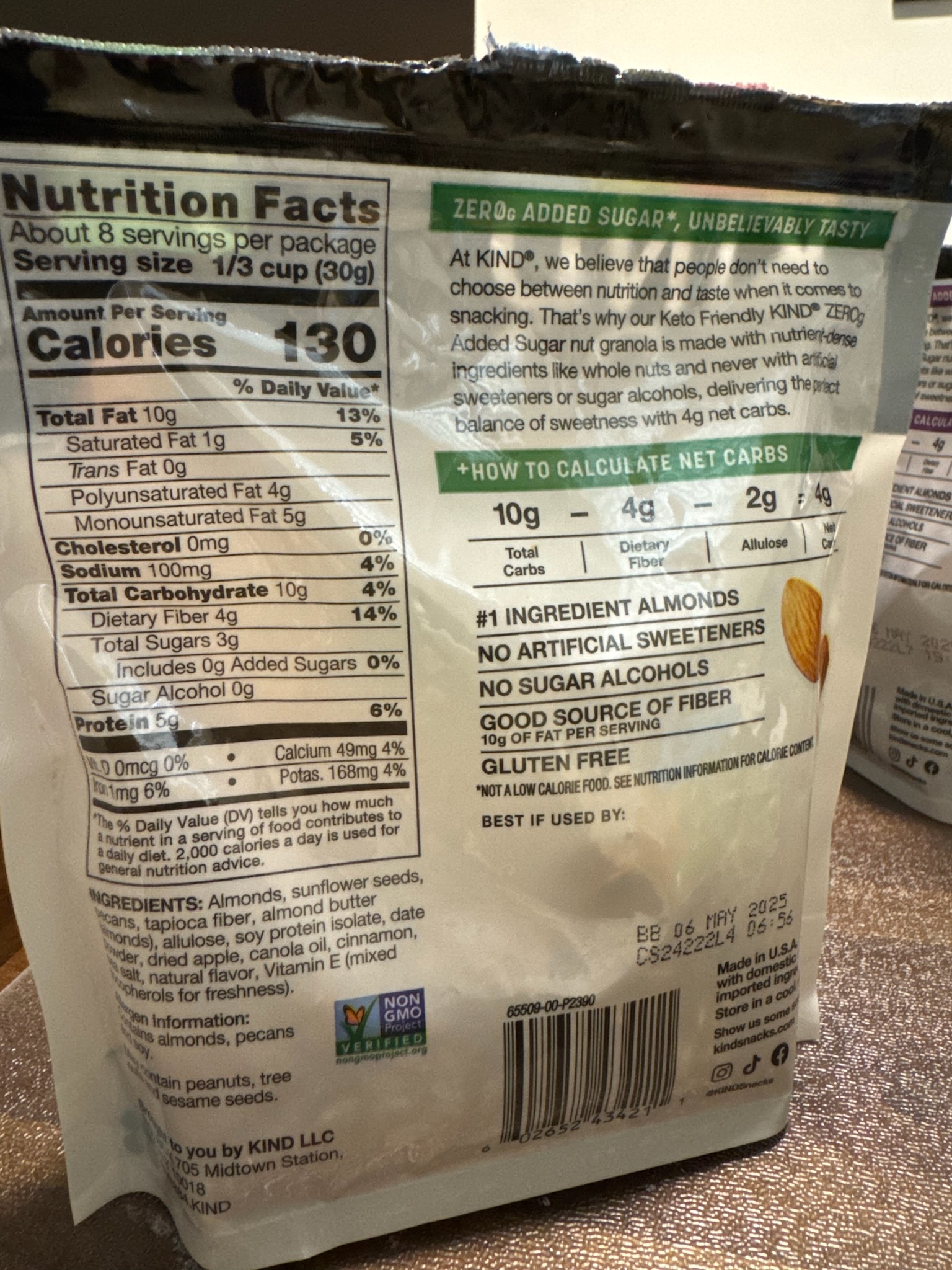 Keto-friendly nut granola: KINDThis is a relatively healthy nut-based granola alternative with a clean ingredient profile. The first ingredient is almonds, followed by other whole nuts and seeds, making it more nutritious than typical grain-based granolas.