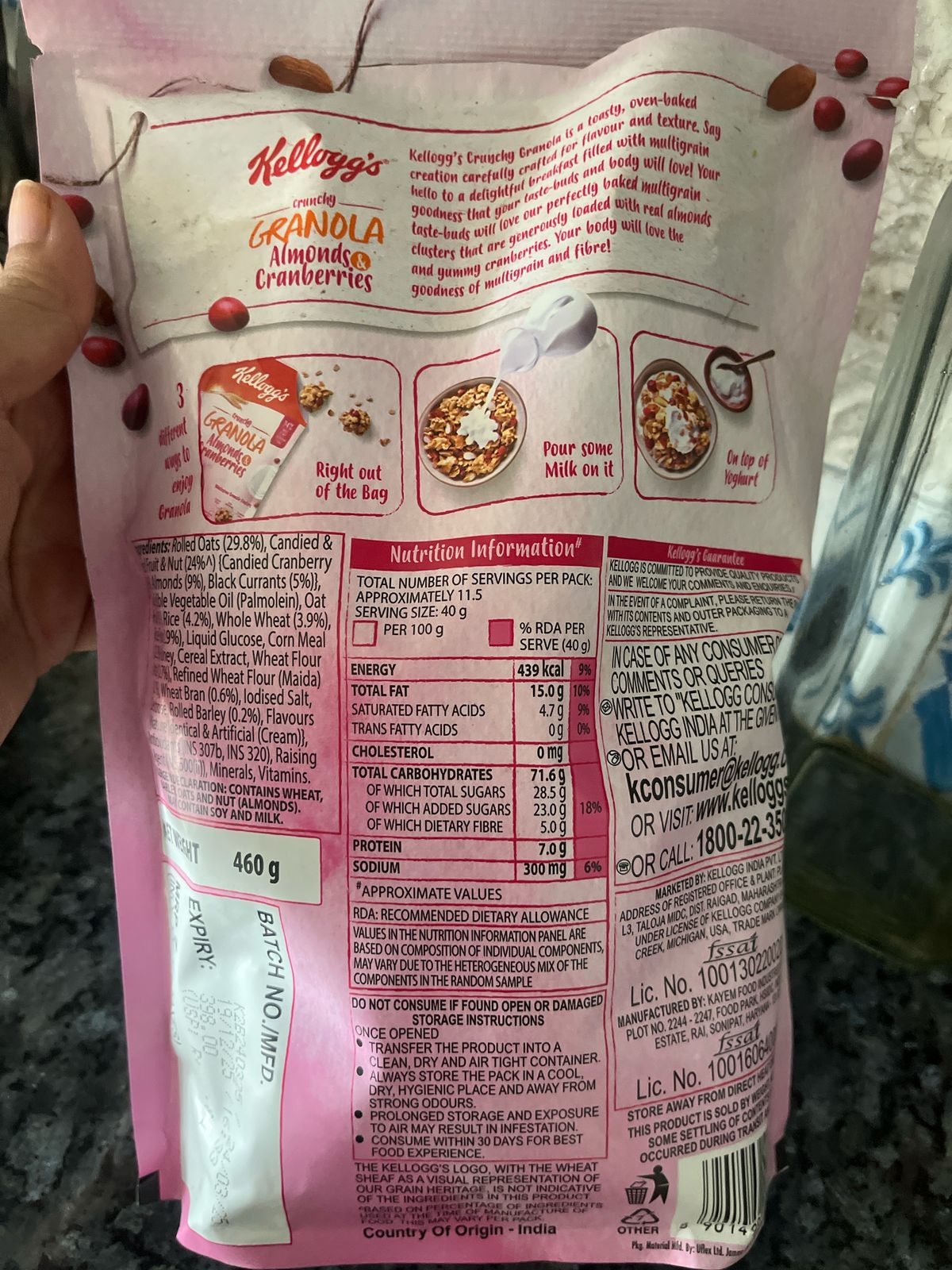 Granola: Kellogg's Crunchy Granola Almonds CranberriesThis Kellogg's granola is a mixed bag. It's positioned as a healthy multigrain option, but let's dive deeper. It's calorie-dense at 439 kcal per 100g, and macros are not ideal.